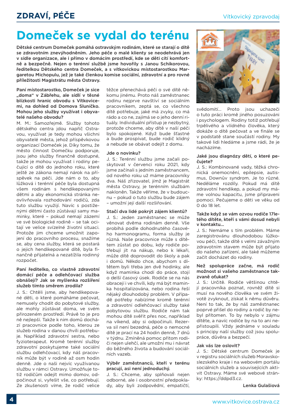 V červnovém čísle Vítkovického zpravodaje si můžete přečíst rozhovor s naší ředitelkou Janou Schikorovou o službách, které Dětské centrum Domeček nabízí.